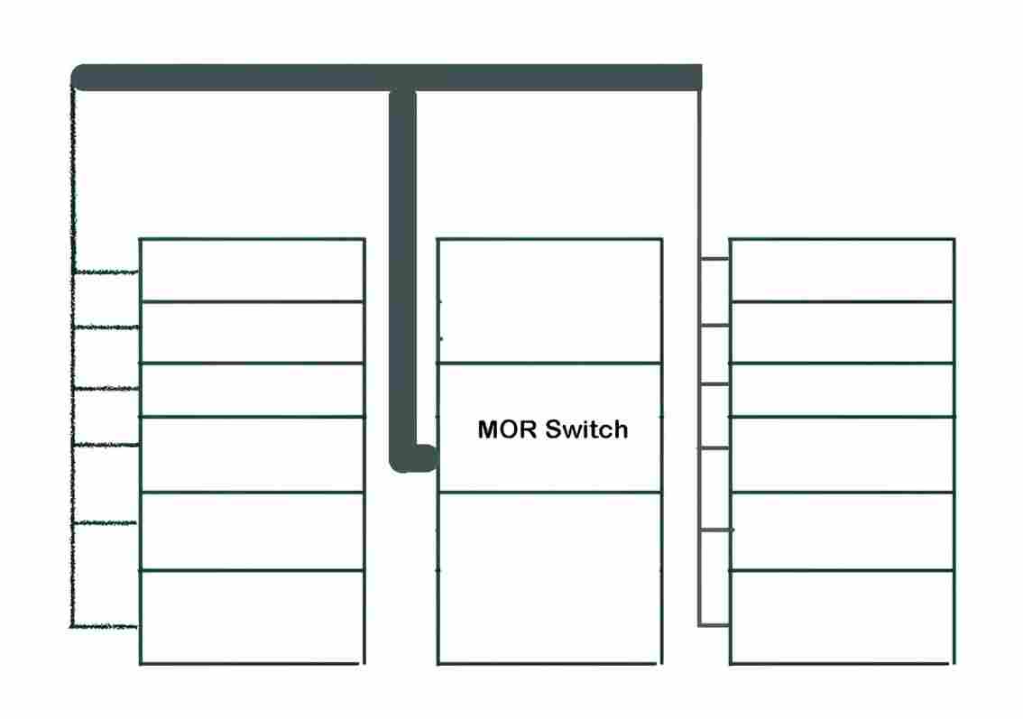 The Middle-of-Row (MoR) architecture positions a switch in the center of each server rack row. In this design, servers within the row connect to this centrally located switch, which is then uplinked to a core switch or router for network-wide connectivity. Its key distinction from EoR is the reduced cable length, as the switch placement minimizes the distance to the farthest servers. Other operational concepts remain similar to the End-of-Row model.