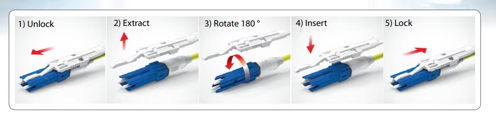 The uniboot design allows one cable to carry both fibers, reducing cable congestion when routing. It is designed for high-density fiber patching in data centers which need space saving and reduce cable management troubles. Its reverse-polarity design allows for quick and easy polarity conversion without exposing the fibers or needing any tools.