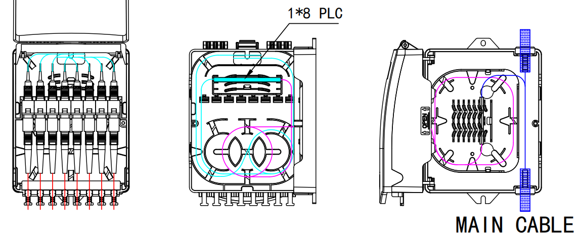 يتم استخدام الجهاز كنقطة إنهاء لكابل التغذية للاتصال بكابل إسقاط في نظام شبكة اتصالات FTTx. يمكن إجراء ربط الألياف وتقسيمها وتوزيعها في هذا المربع ، وفي الوقت نفسه يوفر حماية وإدارة قوية لبناء شبكة FTTx.