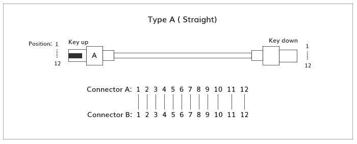 Tipo A (Directo): La posición de los núcleos de fibra en ambos extremos del cable de conexión es la misma; es decir, 1 en un extremo corresponde a 1 en el otro, y 12 en un extremo corresponde a 12 en el otro. La orientación de los pines de conexión en ambos extremos es opuesta: con el pin hacia arriba, el pin hacia abajo.