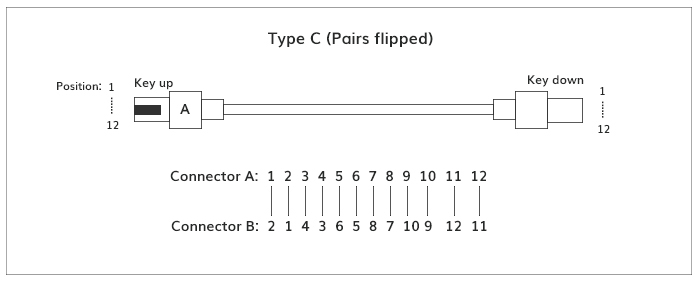 Tipo C (Par Intercalado): En los jumpers MPO de Tipo C, las posiciones de los pares adyacentes de núcleos de fibra están cruzadas. Es decir, el núcleo de fibra 1 en un extremo corresponde al núcleo de fibra 2 en el otro, y el núcleo de fibra 12 en un extremo corresponde al núcleo de fibra 11 en el otro. La orientación de los pines de conexión en ambos extremos también es opuesta: con el pin hacia arriba, el pin hacia abajo.