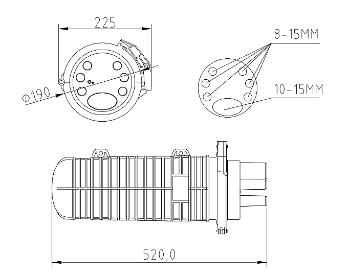 El KXT-M15 FOSC está especialmente diseñado para brindar protección confiable y duradera a fibras ópticas y empalmes, además de una instalación y mantenimiento extremadamente sencillos. El cierre está hecho de polipropileno reforzado con fibra de vidrio, lo que garantiza una larga vida útil. Sello termorretráctil para puertos de cable, con excelente rendimiento de sellado.