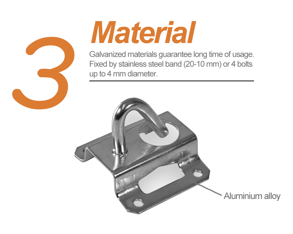 Diseñado para soportar ambos extremos de cables de servicio reforzados de 1 y 2 pares, las abrazaderas de cable de caída pueden soportar el soporte de montaje en poste que está hecho de acero galvanizado, lo que garantiza un largo tiempo de uso.