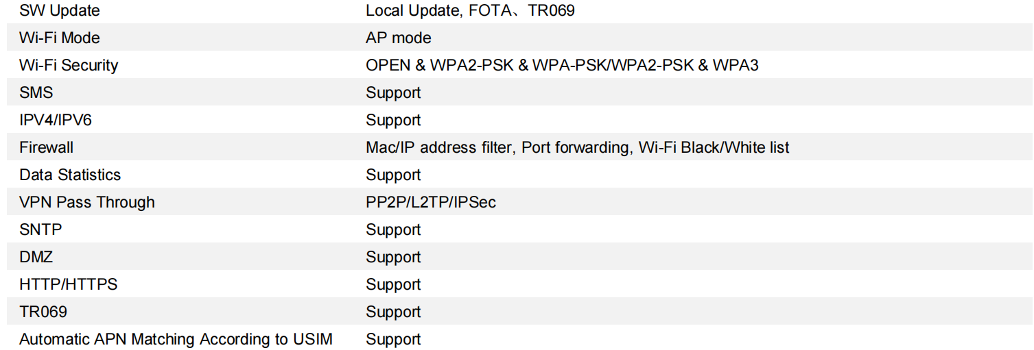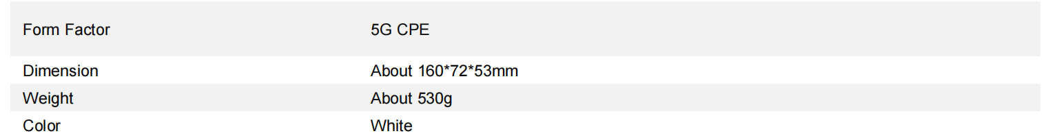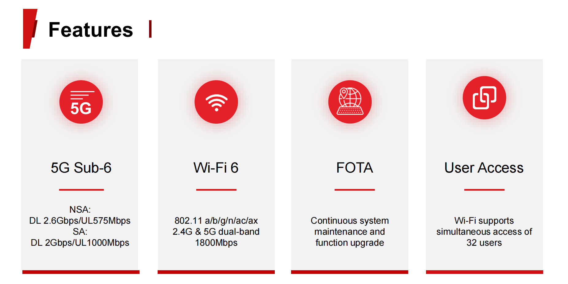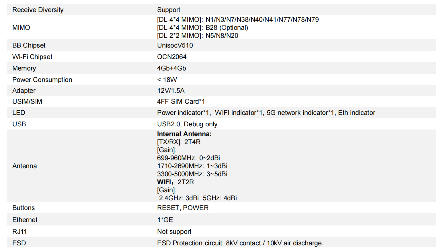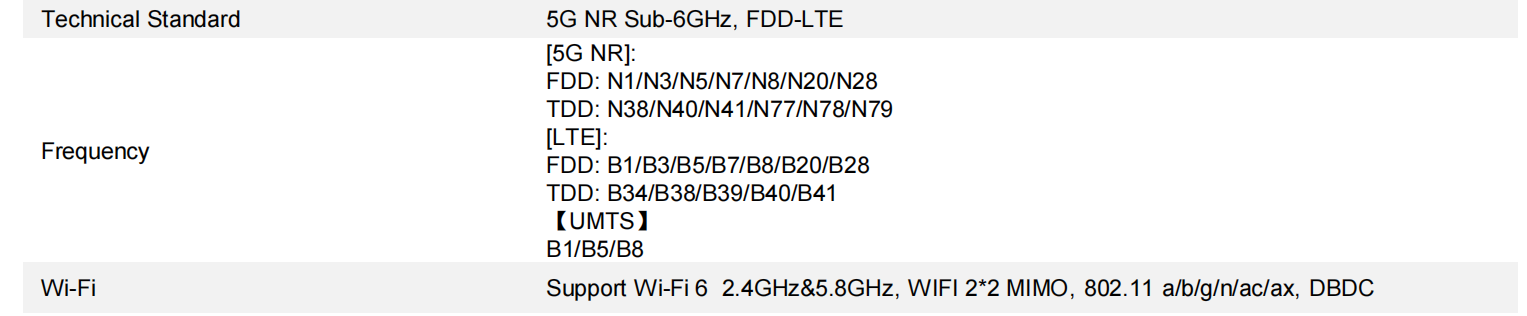 El producto adopta el diseño de solución 5G de alta velocidad UnisocV510, cumple con el estándar 3GPP Versión 15 y puede admitir implementaciones de redes independientes (SA) y no independientes (NSA). Compatible con múltiples estándares de red 4G. Integra el chip Qualcomm Wi-Fi6, admite DBDC de bandas duales 2,4G/5G y permite que varios usuarios accedan simultáneamente y disfruten de una red de alta velocidad.