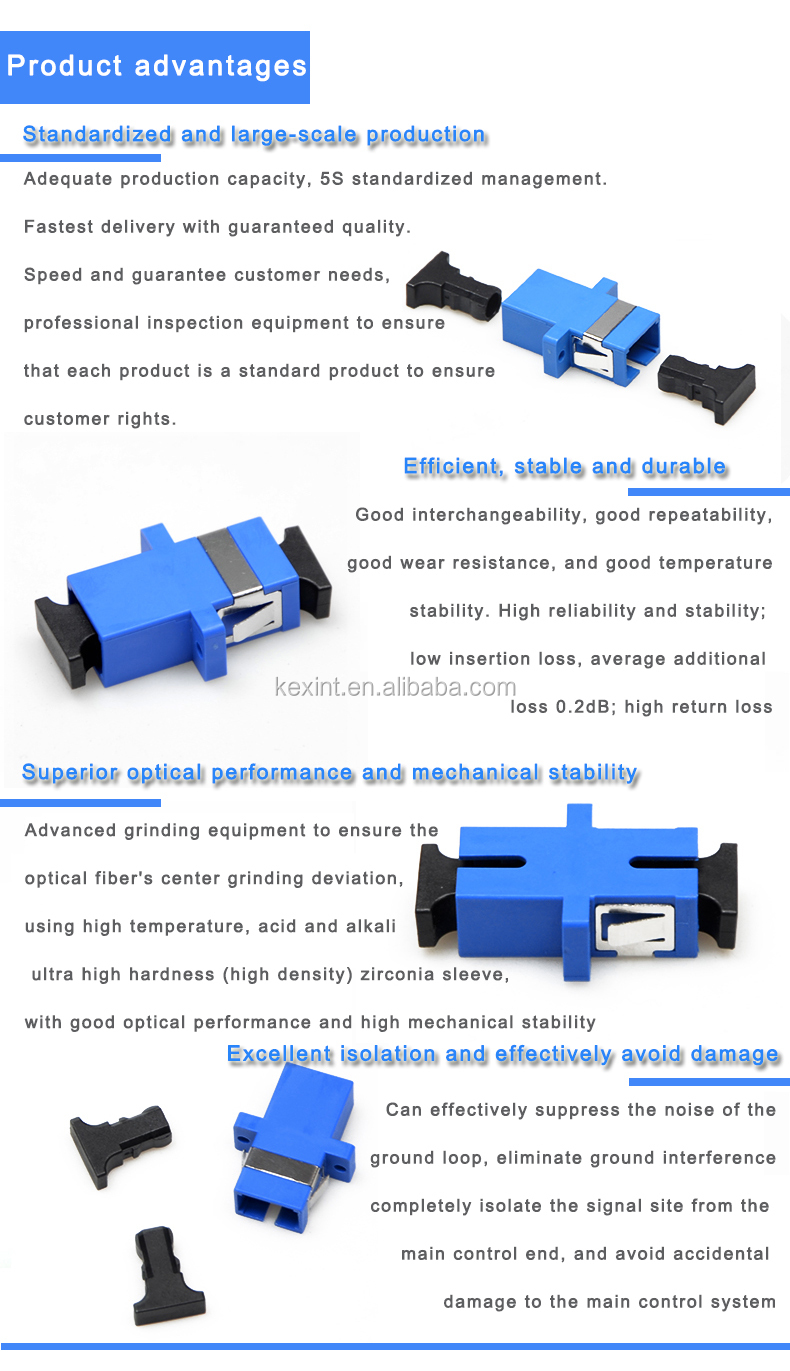 Shenzhen Kexint Technology Co., Ltd. tiene muchos años de experiencia en la fabricación de conectores adaptadores de fibra óptica KEXINT SC/UPC Blue Simplex SM para FTTX. El equipo utiliza el equipo de producción más avanzado y la tecnología independiente de investigación y desarrollo para minimizar el uso del conector del adaptador de fibra óptica KEXINT SC/UPC Blue Simplex SM para el ciclo de desarrollo FTTX y garantizar la alta calidad y la gran confiabilidad del producto. El diseño es el aspecto más llamativo de KEXINT. Su diseño proviene de nuestros diseñadores que son sensibles a la moda y conocen muy bien las necesidades comerciales del mercado. Además, productos de fibra óptica, equipos de red, soluciones de sistemas de comunicación, sistemas de transmisión inalámbrica, sistemas de monitoreo de seguridad hechos de materias primas bien seleccionadas.