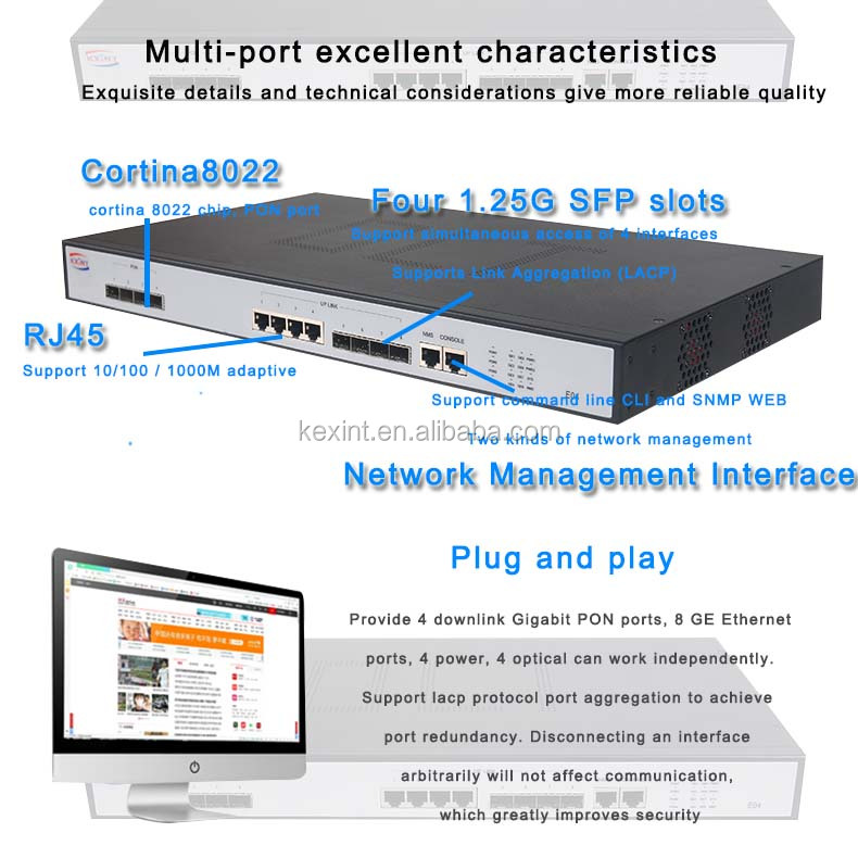 Hay tantos productos diferentes KEXINT FTTH Telecom OLT 4 puertos EPON OLT para diferentes grupos de edad y presupuestos. Se utilizan tecnologías de alta gama para fabricar KEXINT FTTH Telecom OLT 4 puertos EPON OLT. El producto puede desarrollar su mayor efecto en los campos de equipos de fibra óptica. En el futuro, Shenzhen Kexint Technology Co., ltd. Continuará otorgando importancia al cultivo de talentos, mejorando continuamente el nivel comercial y las habilidades profesionales del personal, fortaleciendo la innovación tecnológica y mejorando continuamente la competitividad integral de la empresa, con el fin de lograr "construir una empresa imperecedera centenaria y crear un conocida marca internacional' Trabaja duro para este gran objetivo.