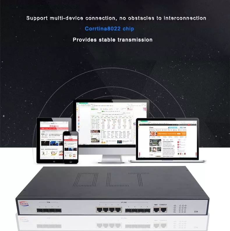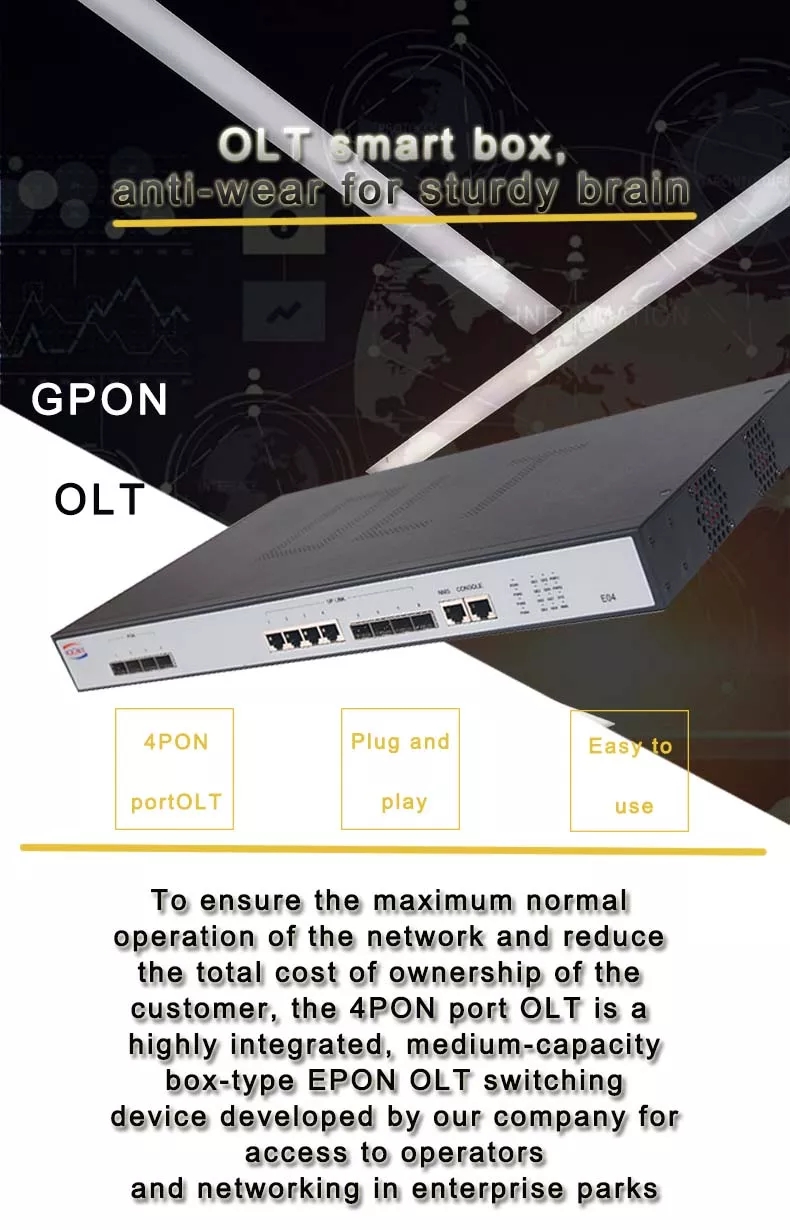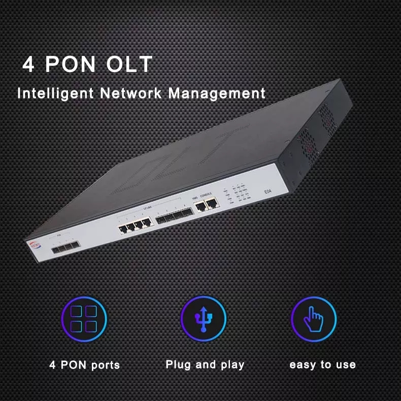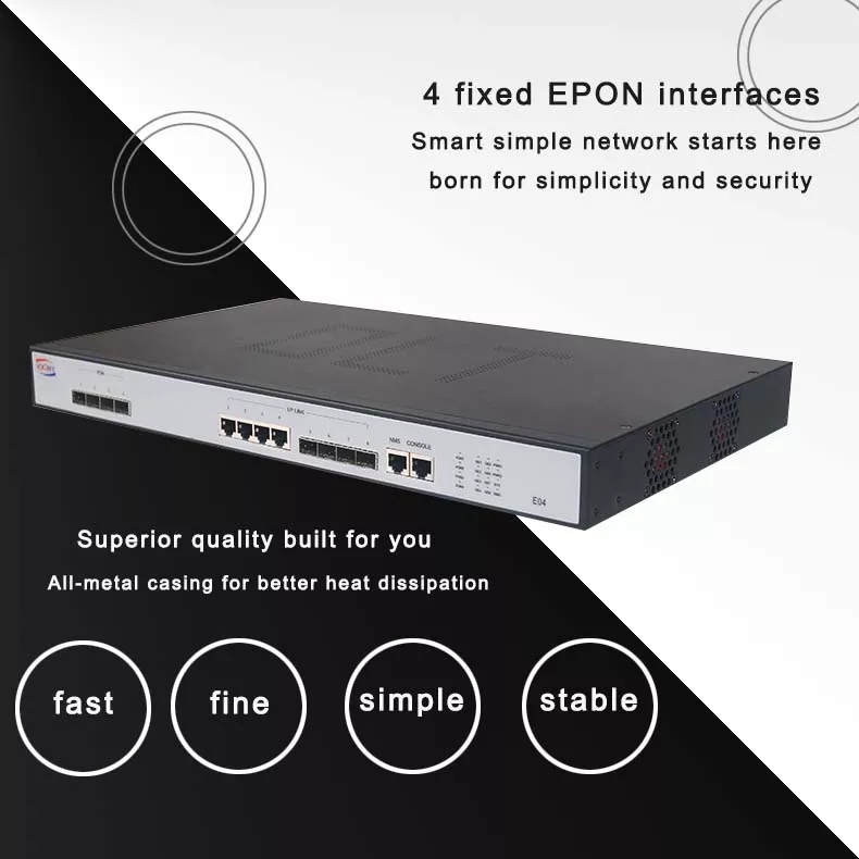 El EPON OLT de 4 puertos admite un máximo de 258 identificadores de enlace lógico (LLID) y asignación dinámica de ancho de banda (DBA). Se adapta a pequeñas redes de acceso de fibra, como ciudades, pueblos, que no tienen una gran cantidad de usuarios. El sistema EPON de 4 puertos reduce considerablemente el costo de establecer la red y asegura un alto ancho de banda. También se adapta a proyectos FTTH/FTTB/FTTO, para implementar fibra hasta el hogar, como teléfono IP, datos Ethernet y acceso a servicios de IPTV.