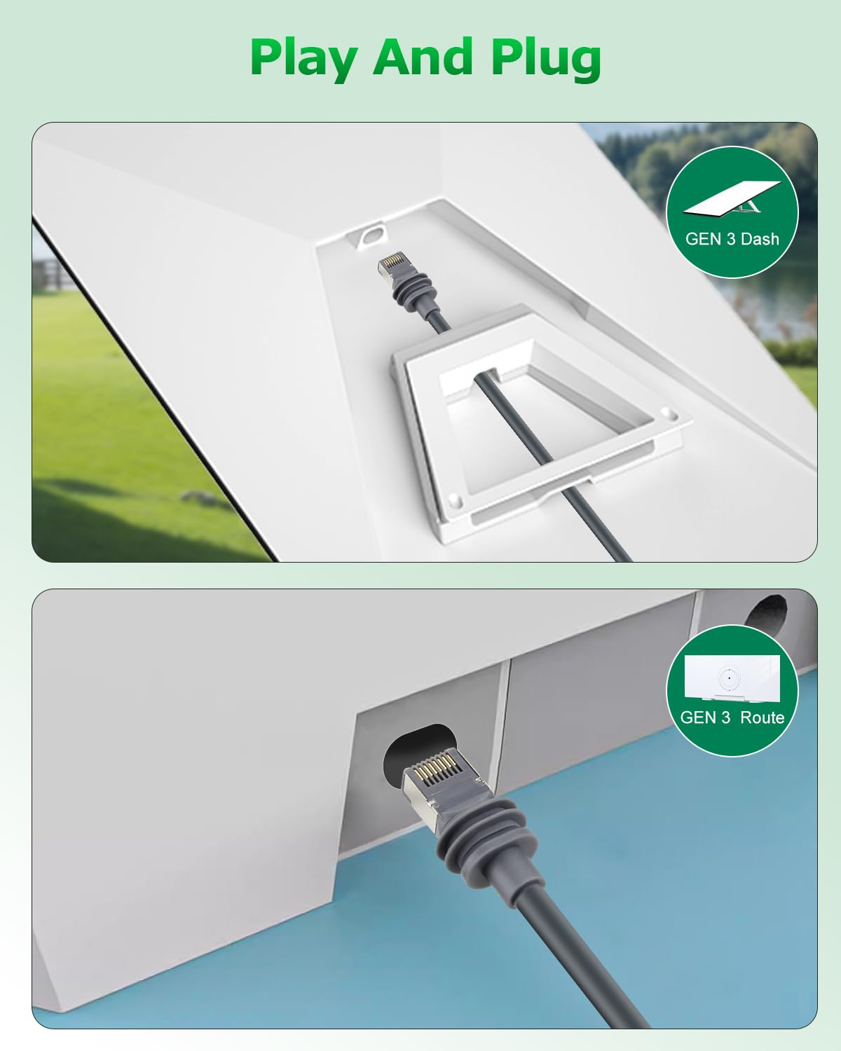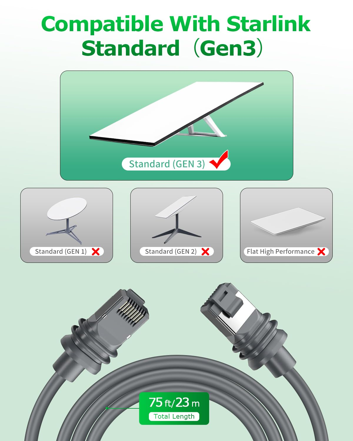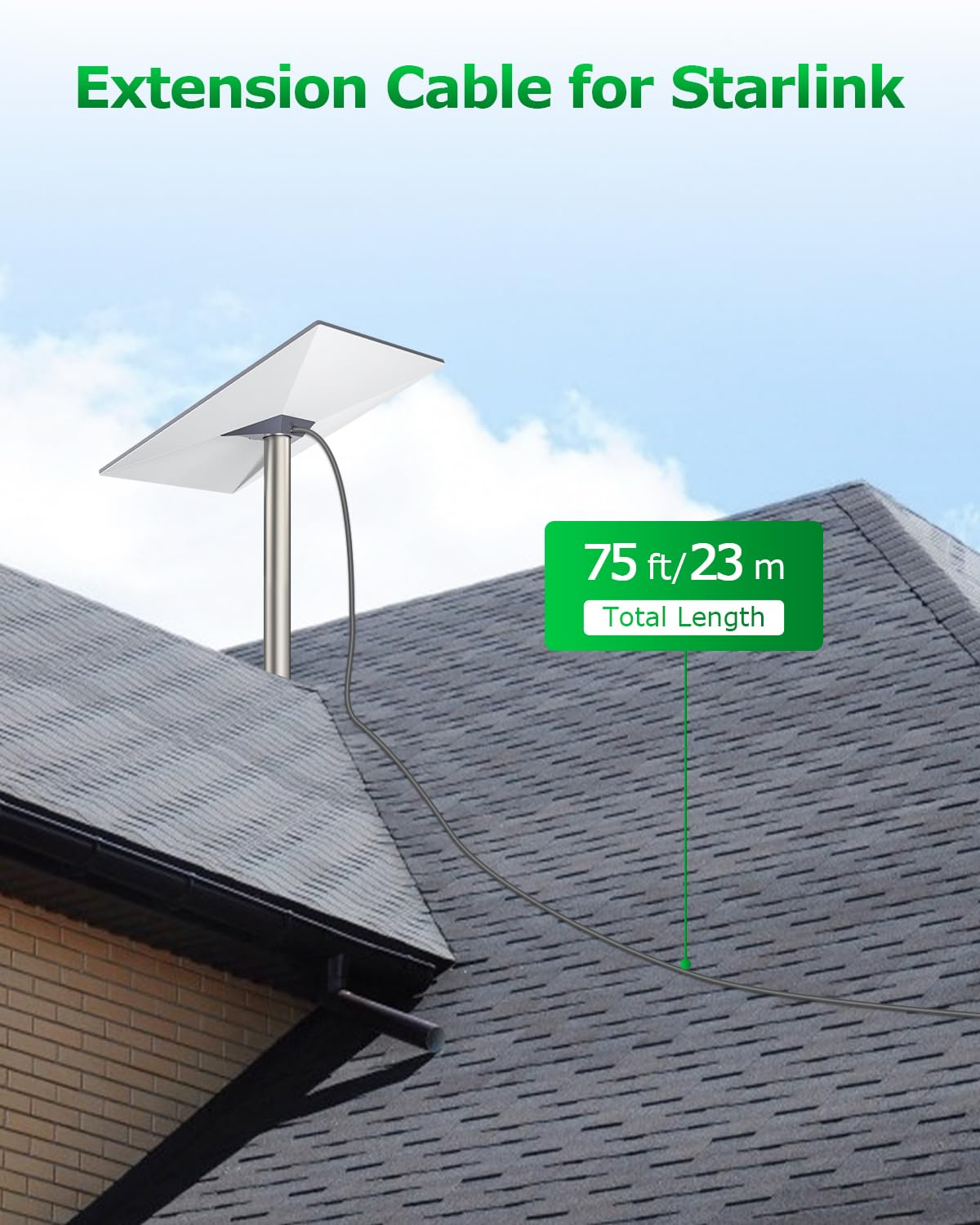 El cable Starlink Gen 3 está diseñado para ser compatible con el satélite rectangular Starlink V3. Con una longitud de cable extra larga de 23 m (75 pies), es apto tanto para interiores como para exteriores. Ya sea en el techo de una casa rodante o en una autocaravana, satisfará todas sus necesidades de forma fácil y eficiente, sin importar el espacio.