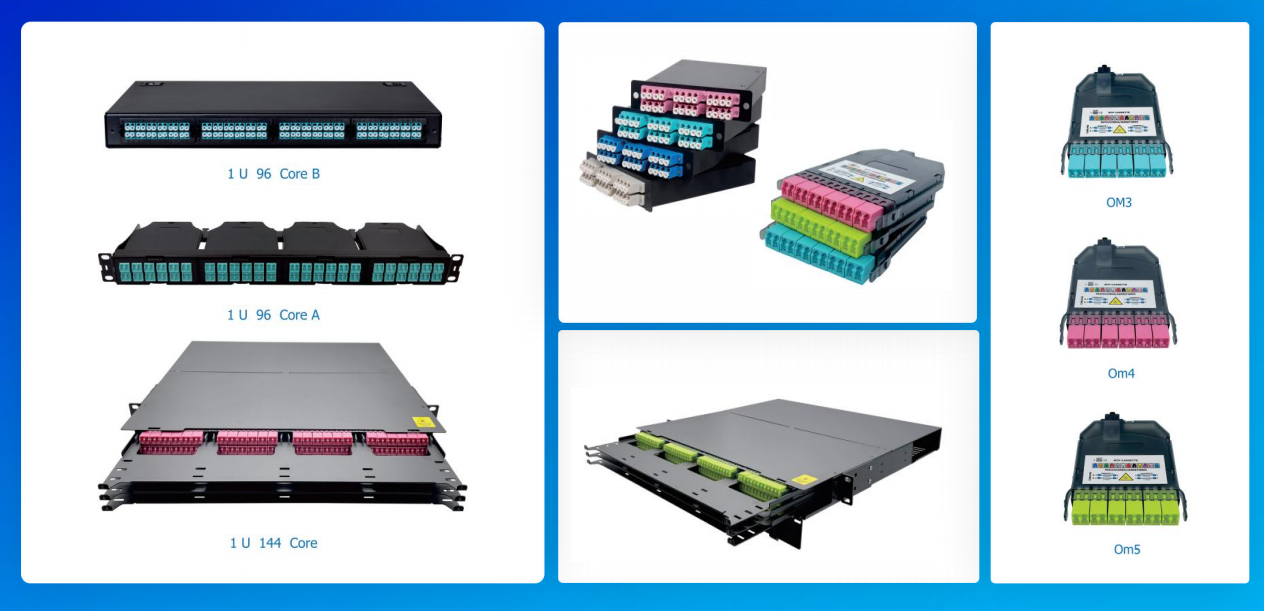 La interfaz MPO se utiliza generalmente para la entrada de la caja modular, que presenta baja pérdida de inserción, admite una gran cantidad de núcleos y permite un cableado de alta densidad. El panel de conexión modular de alta densidad se puede utilizar en diversos escenarios de aplicación y se compone principalmente de una caja y una caja modular. El panel de conexión modular de alta densidad es fácil de instalar y se puede instalar, desmontar y mantener rápidamente. Su capacidad de cableado de alta densidad puede resolver la mayoría de los problemas, como las operaciones de terminación, cableado, instalación y mantenimiento. Si la capacidad del gabinete de la sala de datos IDC es limitada, se puede utilizar el panel de conexión modular de alta densidad MPO, que no solo satisface las necesidades básicas de uso, sino que también ahorra espacio, ofrece buena flexibilidad y resuelve rápidamente los problemas de cableado y ramificación.