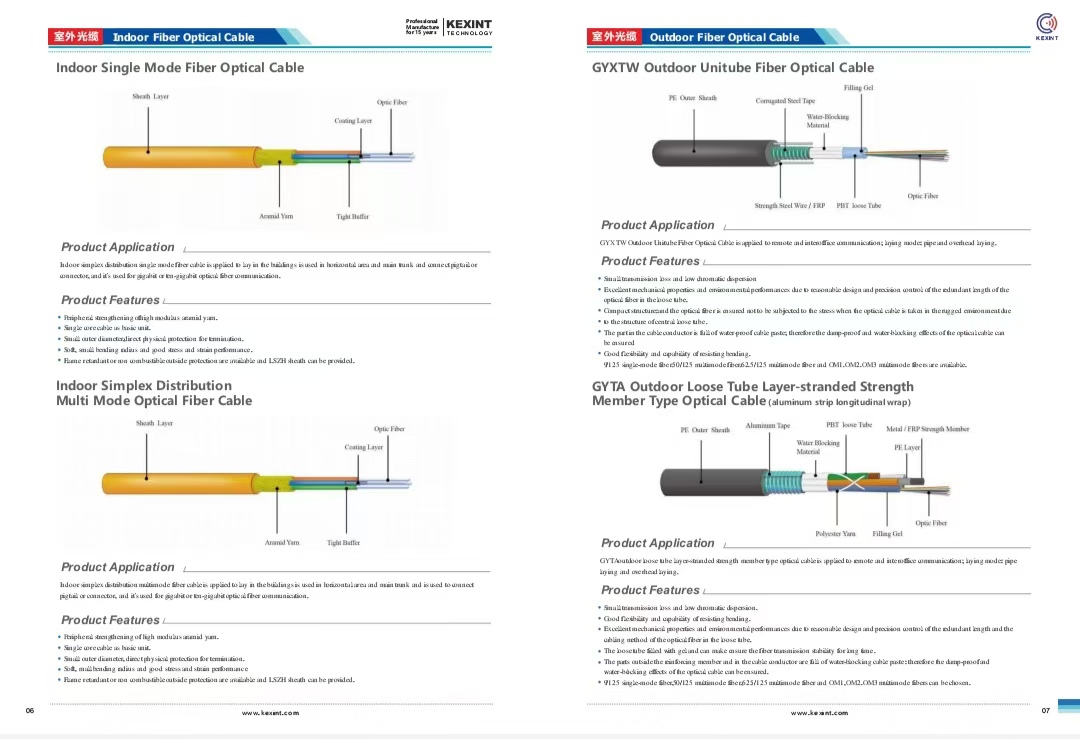 Cable óptico para interiores: radio de curvatura ≥ 10 veces el diámetro del cable óptico, construcción flexible, puede instalarse a través de tuberías, canaletas o por encima de la cabeza. Se deben tener en cuenta las propiedades ignífugas para evitar interferencias de señal.