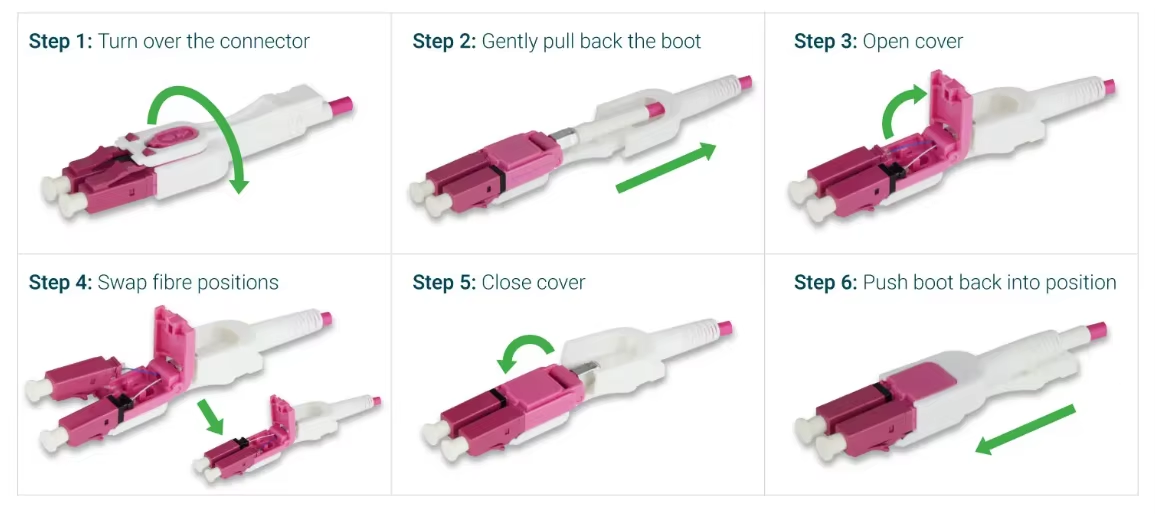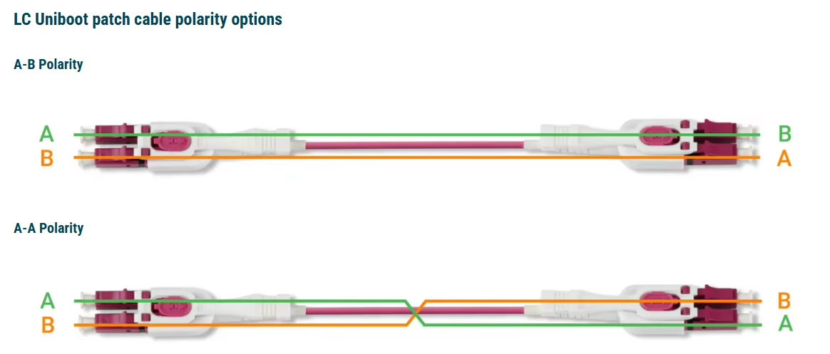 Uniboot-rakenteen ansiosta sama kaapeli voi kuljettaa molempia kuituja, mikä vähentää kaapelien ruuhkautumista reitityksen aikana. Se on suunniteltu tiheästi asennettaviin kuituihin datakeskuksissa, joissa on säästettävä tilaa ja vähennettävä kaapelien hallintaongelmia. Sen käänteinen napaisuus mahdollistaa nopean ja helpon napaisuuden muuntamisen paljastamatta kuituja tai ilman työkaluja.