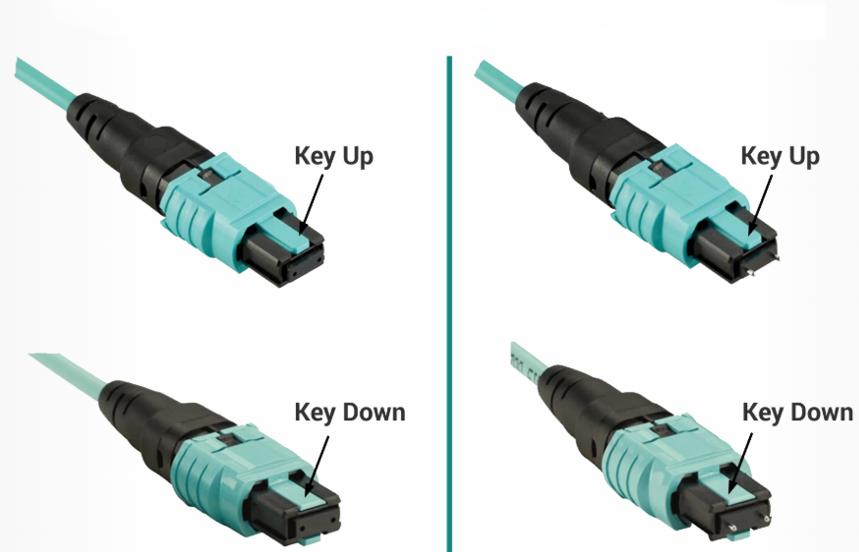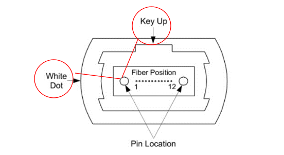 MPO connectors can accommodate 8 to 72 fibers, with 12-fiber arrays being the most common configuration for enterprise data center applications such as 40 Gb and 100 Gb. Each connector is either male (with ferrules) or female (without ferrules) to ensure that the fiber end faces remain aligned during the mating process. MPO connectors also include a key on the top of the connector and a white dot on the side to indicate the location of position 1. As shown in the figure above, the orientation of the key is also critical when it comes to polarity.