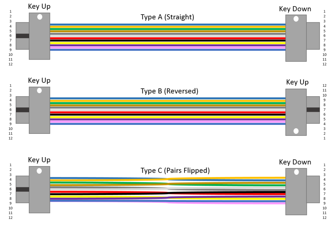 Type A is a straight-through MPO trunk cable with a Key Up connector on one end and a Key Down connector on the other end, which allows the fiber in position 1 to go to position 1 on the other end. Type B cables are Key Up to Key Up, so the fiber in position 1 goes to position 12 on the other end, the fiber in position 2 goes to position 11 on the other end, and so on. Type C cables flip the pairs so that the fiber in position 1 goes to position 2 on the other end, and the fiber in position 2 goes to position 1.
