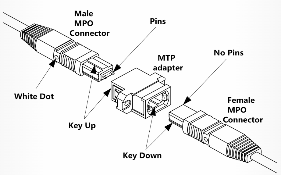 To make an MPO connection between two MPO fibers, an MPO adapter must be used, and the connector types should be opposite. This means that only male-to-female connections can be achieved, not male-to-male or female-to-female connections. If female connectors are used on both ends of the adapter, the performance will be very low because the fibers cannot be aligned without male pins. On the other hand, using two male connectors is impossible and may damage the connectors.