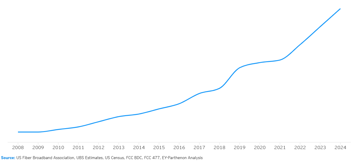 As of the end of 2024, nearly 80 million US homes had access to fiber – more than half of residences in the country – up from approximately 60 million in 2022.1 The drive for fiber has been accelerated, in part, by government subsidies, such as the $42b of Broadband Equity, Access and Deployment (BEAD) funding set aside to improve the US’s broadband internet infrastructure.