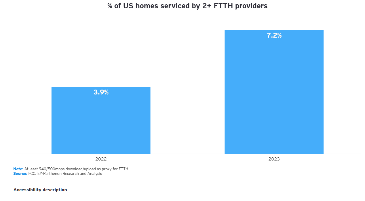 The shrinking development landscape means the risk of overbuilding has increased significantly in many of the denser areas. According to the Federal Communications Commission’s (FCC) US Communications Marketplace Report, in 2022, roughly 4% of US homes had access to two or more FTTH options: typically, incumbent local exchange carrier (ILEC) fiber. In 2023, the number rose to approximately 7% of US homes, a near doubling in FTTH versus FTTH provider competition.