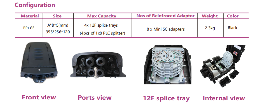Penutupan terminasi fiber splitter KXT-C16 mampu menampung hingga 8 pelanggan. Ini digunakan sebagai titik terminasi kabel feeder untuk terhubung dengan kabel drop dalam sistem jaringan FTTx. Ini mengintegrasikan penyambungan, pemisahan, distribusi, penyimpanan, dan sambungan kabel serat dalam satu kotak pelindung yang kokoh.