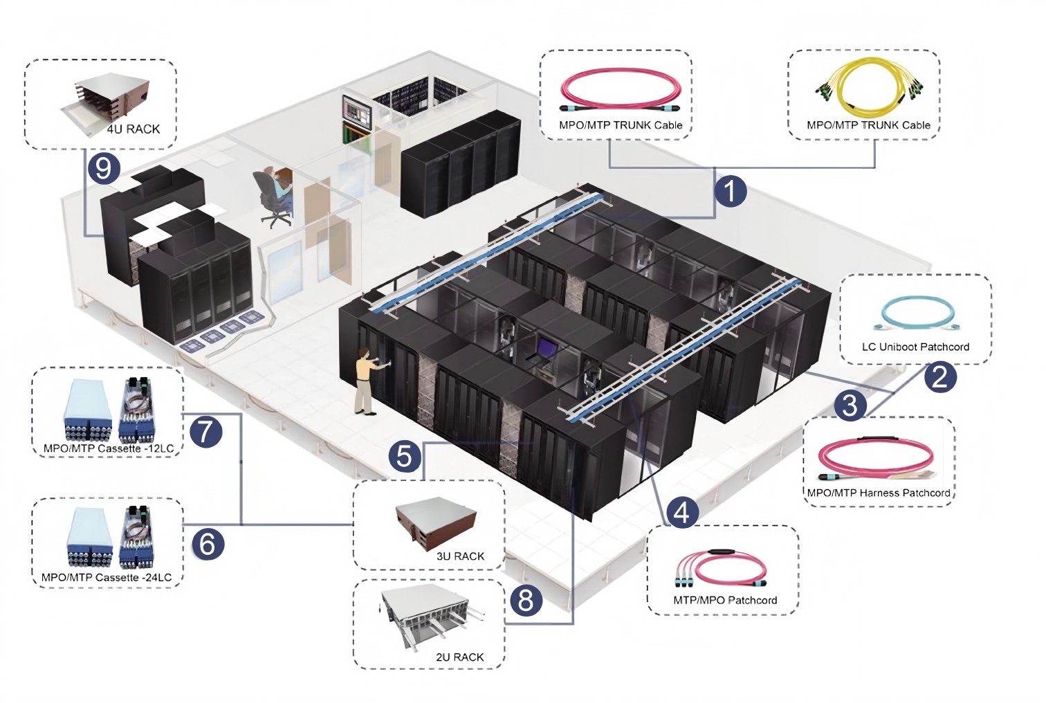 4U rack: Supports 576-core fiber optic connections, designed for the core data center of large-scale AI data centers, meeting the ultra-high-density connection needs of tens of thousands of GPU clusters, reducing the number of racks and lowering data center energy consumption and footprint.
