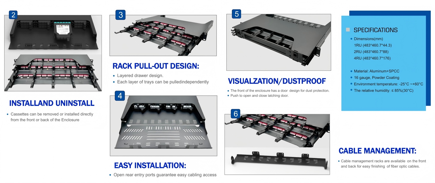 1U rack: Supports 144-core fiber optic connections, suitable for edge nodes or space-constrained areas, achieving high-density termination within a 1U (1.75 inch) height;