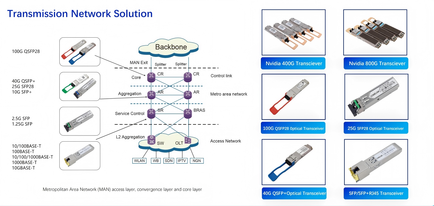 100G Optical Modules: Suitable for basic interconnect scenarios in small and medium-sized AI data centers, such as connecting servers to access layer switches;