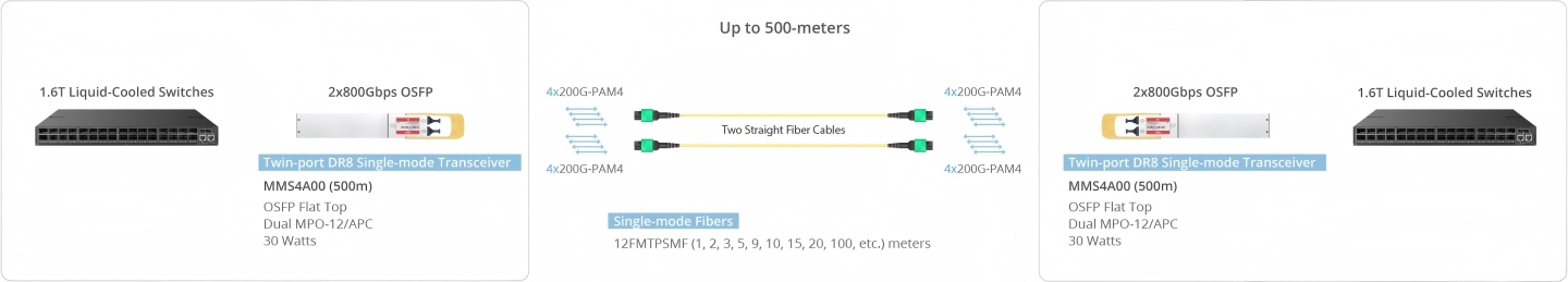 OSFP-1.6T-2xDR4H Optical Transceiver Module is an InfiniBand and Ethernet 1.6Tb/s 2x800Gb/s Twin-port OSFP224, 2xDR4/DR8 single mode, Silicon photonics-based, parallel, 8-channel transceiver using two, 4-channel MPO-12/APC optical connectors at 800Gb /s each. The parallel single mode, data center reach 8-channel (2xDR4/DR8) design uses 200G-PAM4 modulation and has a maximum fiberreach of 500-meters using 8 single mode fibers. The main application for OSFP-1.6T-2xDR4H is linking two switches together with up to 500 meters.