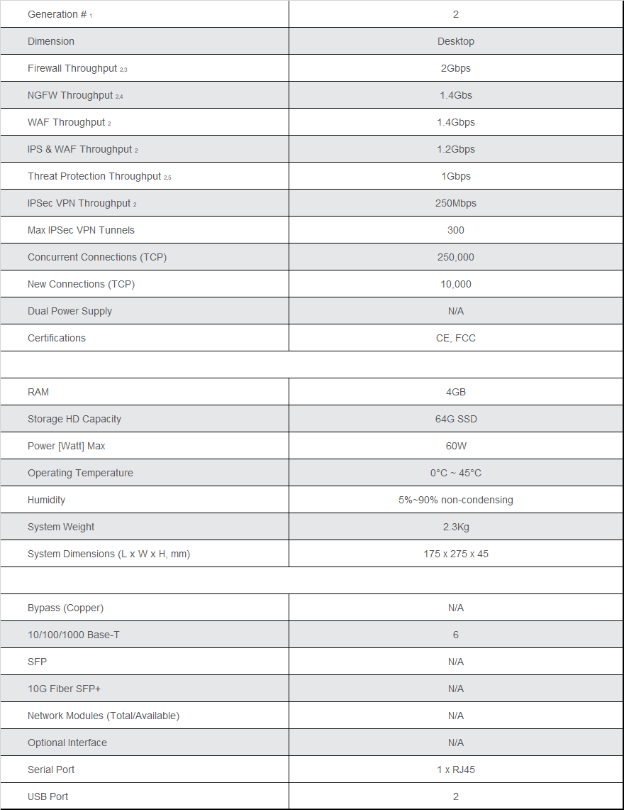 | 80F | Hardware appliance, 6 x GE RJ45, 1 x available NIC slot. Default with 64GB SSD, 1 x available NIC slot. Support 2.8 Gbps Firewall Throughput, 1.8 Gbps Threat Prevention Throughput. | 300 x 430 x 45 | 3.85 Kg |