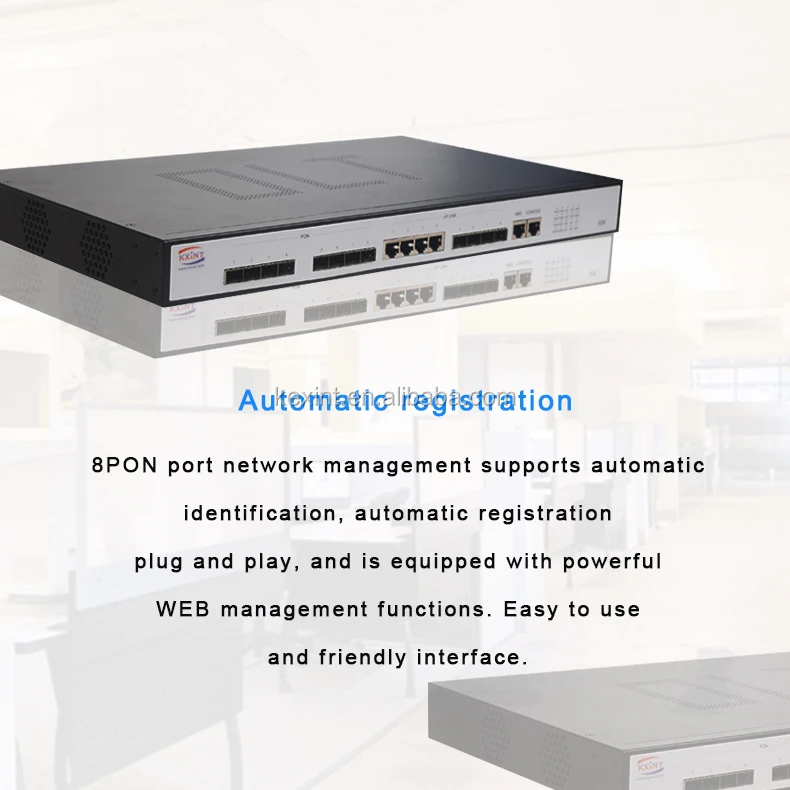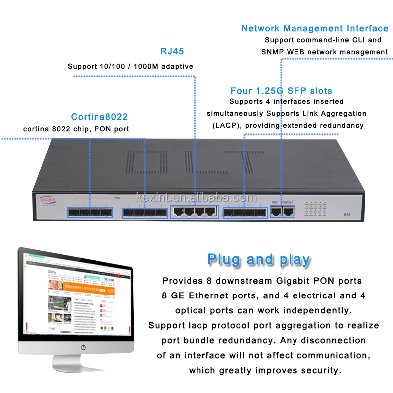 We are specialized in manufacturing GPON OLT 8Port Support Network Management DBA and SLA Compatible with Any ONU, etc. for over many years. Well-integrated use of technologies contributes to the high-efficiency manufacturing process.It has been proved that the product is indispensable in the field(s) of Fiber Optic Equipment. The launch of a product that perfectly solves the industry's pain points is that Shenzhen Kexint Technology Co., ltd. has always adhered to the goal of technological innovation, and the newly developed products perfectly solve the pain points that have been lingering in the industry for a long time. Once launched, they have been enthusiastically sought after by the market.