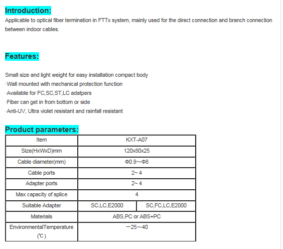 Его основные продукты включают волоконно-оптическое кабель, распределитель волокна, оптоволоконно-оптическую плачев, MPO / MTP и оптический разветвитель (PLC / FBT / WDM), быстрый соединитель, волоконно-оптические адаптеры, волоконные оптические аттенюаторы, у нас более 11 лет опыта в пассивных волоконно-оптических продуктах. В 2016 году мы также создали OLT / ONU R&D и производство. Продукты широко используются в телекоммуникациях, вещании и других областях. Телевидение, энергетика и другие отрасли промышленности. Основное распределение рынка: Россия и другие СНГ, Южная Африка, Европа, Южная Америка и т. Д. Компания Обещает: Сначала качество и целостность