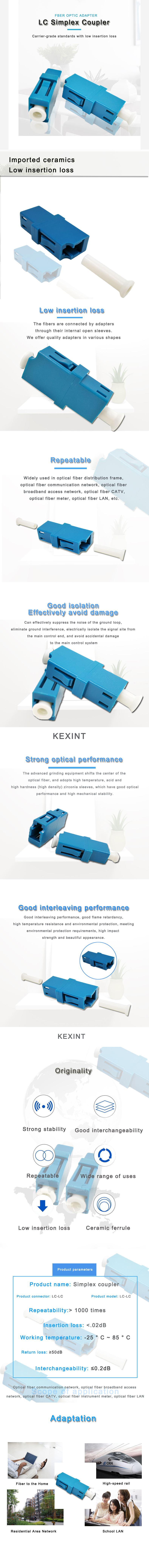 Ang LC / UPC optical fiber adapter (tinatawag ding flange) ay isang passive device na ginagamit sa pagitan ng optical fiber connector plugs. Ito ay may mataas na dimensional na katumpakan, mababang pagkawala ng pagpapasok, magandang repeatability, magandang interchangeability, at mahusay na temperatura katatagan. Ito ay may mahusay na optical performance at mataas na mekanikal katatagan.