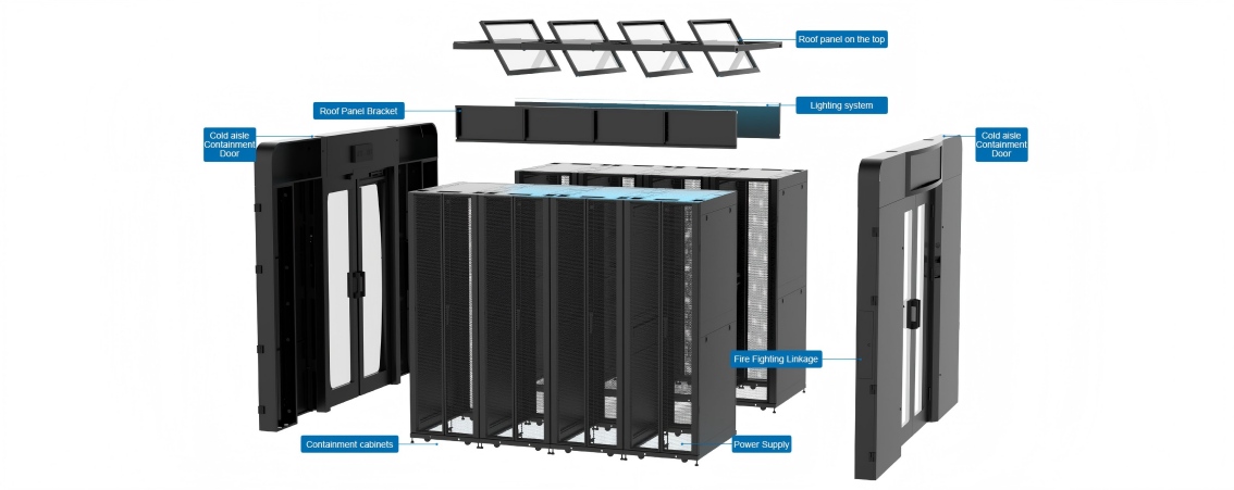 Under normal operation, the roof panels are held horizontally by electromagnets. In the event of a fire alarm, power to the electromagnets is cut, and the panels open by gravity, allowing extinguishing gas to enter the cold aisle containment.