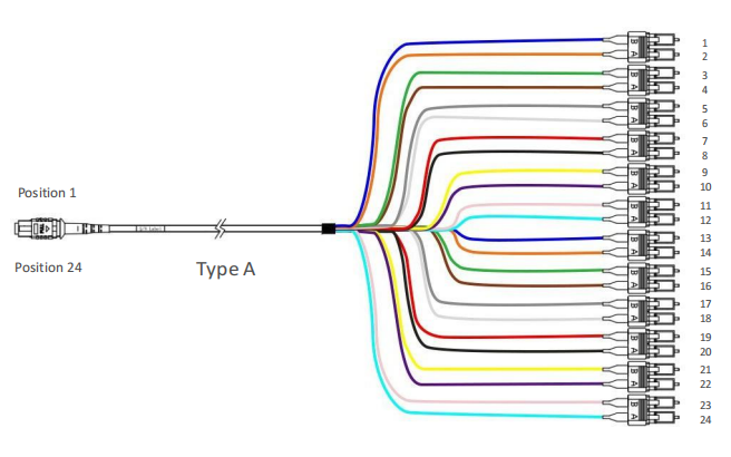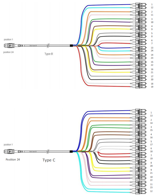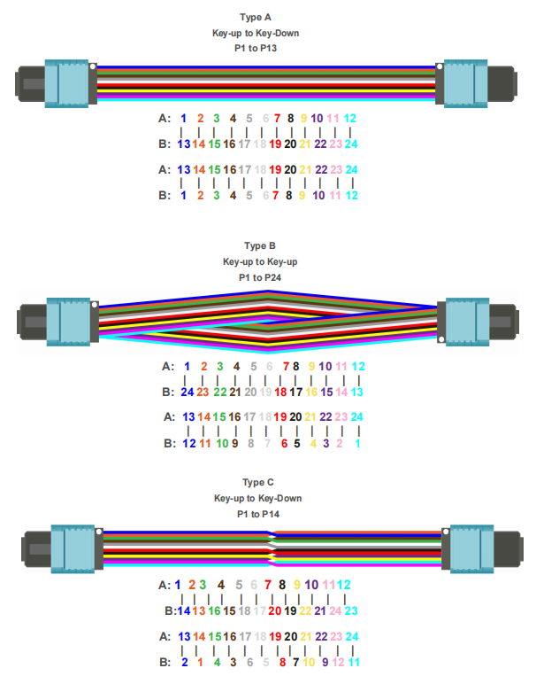 There are three different 24-fiber MTP/MPO branch patch cords: Type A, Type B, and Type C.