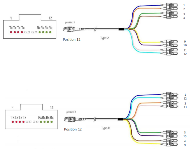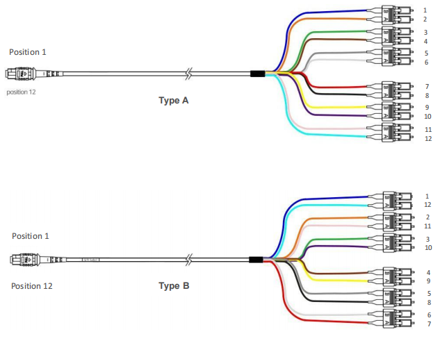 There are two different 12-fiber MTP/MPO branch patch cords: Type A and Type B.