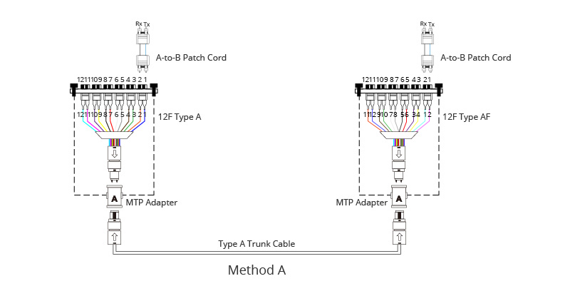 Each polarity method (A, B, and C) utilizes a corresponding type of MTP® trunk cable. To complete an end-to-end duplex fiber circuit, all three methods also require duplex patch cables at both ends. The TIA standard specifies two variants of these duplex patch cables—typically terminated with LC or SC connectors: the A-to-A type (a crossed version) and the A-to-B type (a straight-through version).